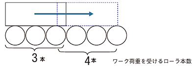 安定搬送条件1:ローラ(モータローラ及びフリーローラ)が常時3本以上ワーク荷重を受ける