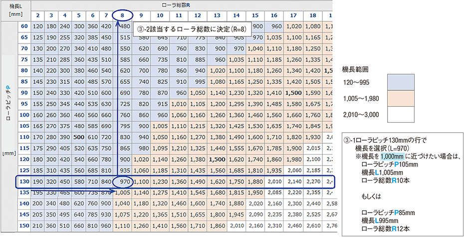 ステップ2で選択したローラピッチPを基準に、機長早見表を参照いただき、機長Lを選択してください。