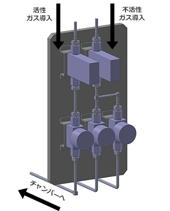 | 【供給側】高純度ガス配管 | 高純度ガス配管は、真空チャンバ内に高純度ガスを供給する配管。高いクリーン度とシール性が求められる。 管にはSUS316LのBA管・EP管、継手にはメタルガスケット式面シール継手(VCR®、UJR®など)が主に使用される。 |