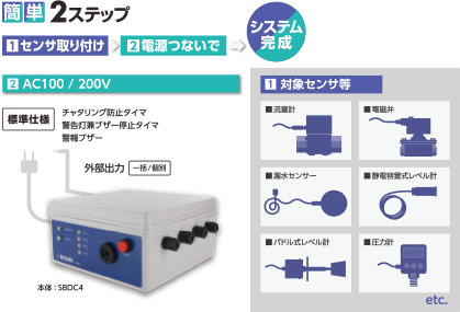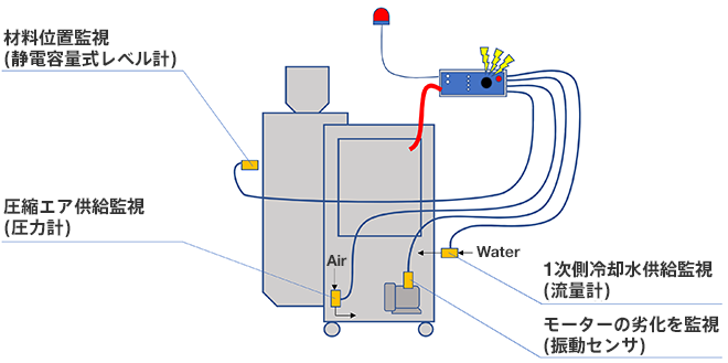センサをつなげれば監視システムの完成です!電源は設備からもAC100Vコンセントからも取ることができます。