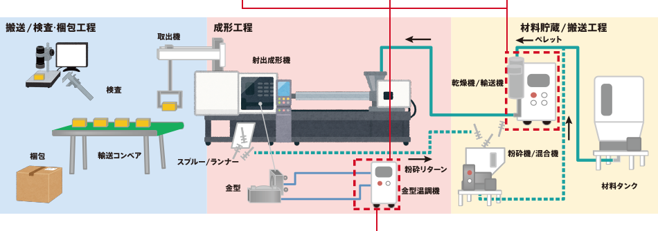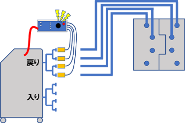例えば、金型ホットランナーの配線繋ぎこみにおいて、ヒーター線とセンサー線は何本もあり、一般的にコネクター接続になっています。