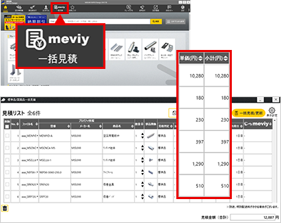一括で見積もりが可能です。さらに加工品の3Dデータはmeviyによる詳細見積が取得できます。meviyで取得した型番は、自動でCAD上へ戻すことも可能です。