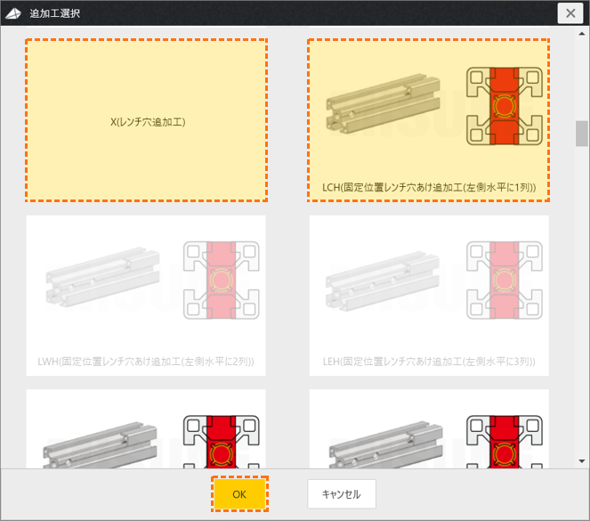 アルミフレームで【ザグリ穴】、【レンチ穴】を設定するためには、2つの追加工を選択してください。