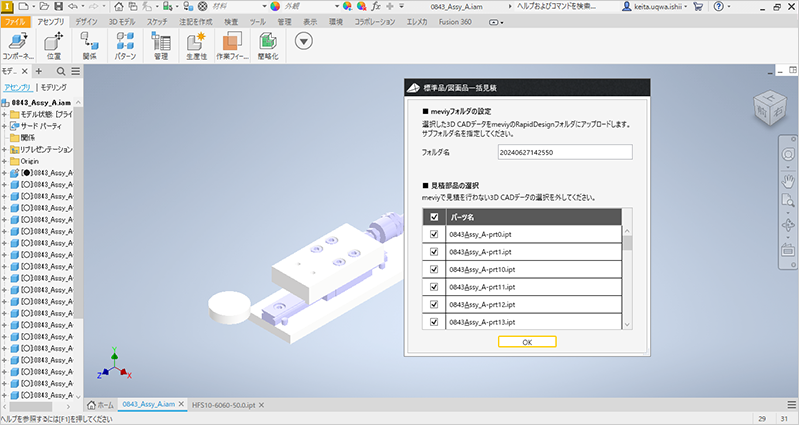 3「meviyフォルダの設定/見積部品の選択」画面が表示されます。