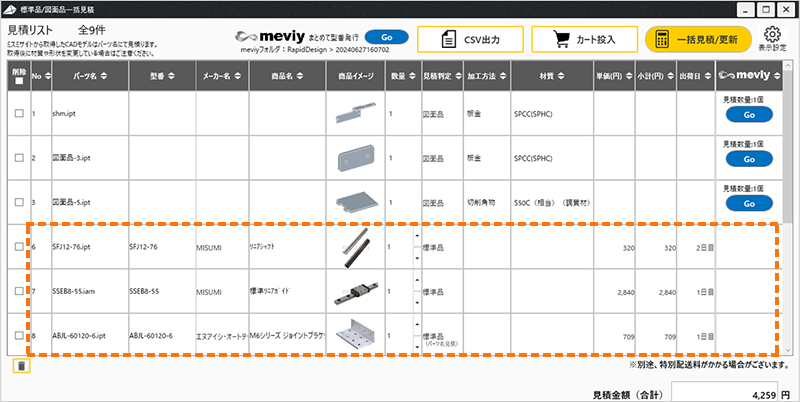 2見積リストが作成され、RAPiD Designでインポートしたモデル(標準品)の価格と出荷日が表示されます。
