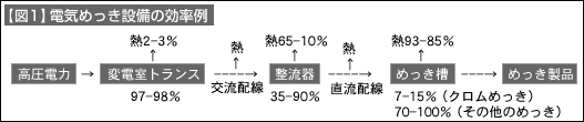 一例として、電気めっきのなかで一番電流効率の低い例として、クロムめっきの工場の電力消費効率を【図1】にあげることにしましょう。