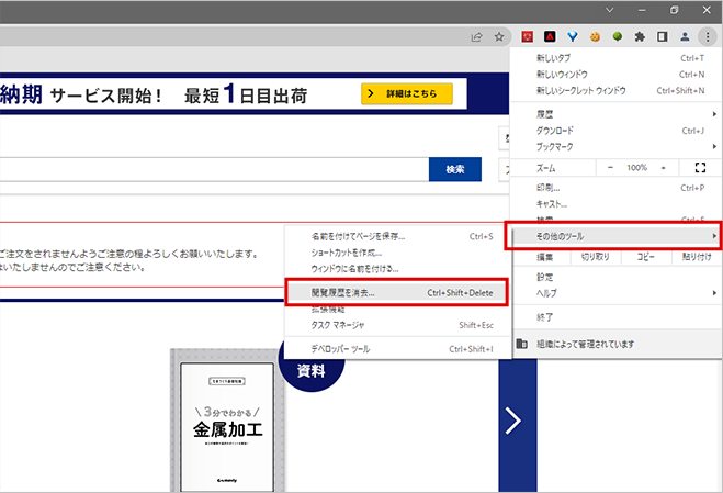 1. Chromeを起動し、画面右上にあるChrome メニューをクリックし、[その他のツール]>[閲覧履歴を消去]をクリックします。