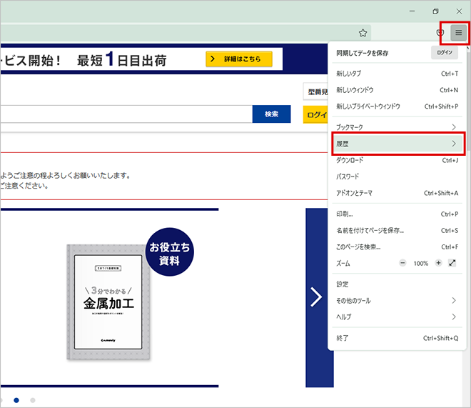 1. Firefoxを起動し、画面右上にあるFirefoxメニューをクリックし、[履歴]をクリックします。