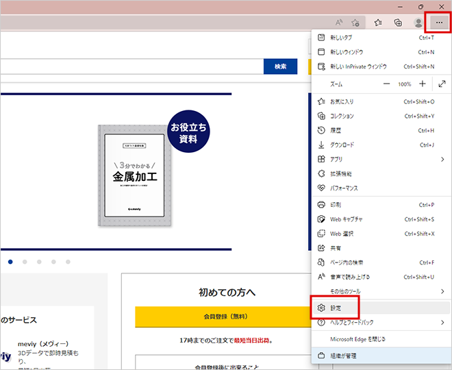 1.Edgeを起動し、画面右上の[…]をクリック。その後、メニュー下の「設定」をクリックします。