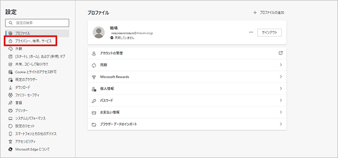 2.左側の設定メニューから、「プライバシー、検索、サービス」をクリックします。