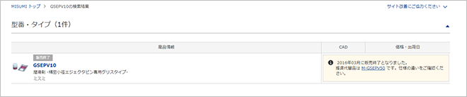 代替品がある場合は、検索結果に表示され、型番をクリックすると代替品の商品情報を確認できます。