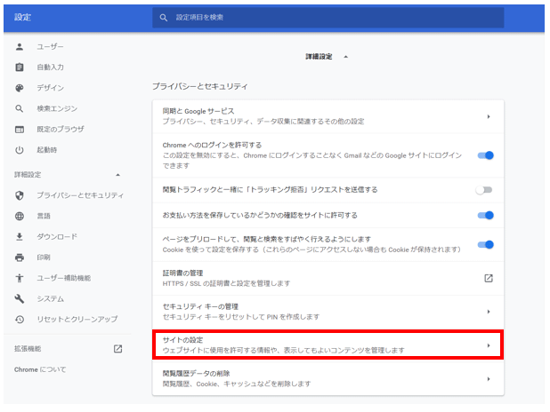 3. [プライバシーとセキュリティ] セクションで [サイトの設定] をクリックします。