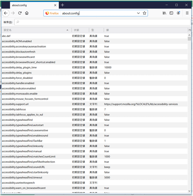 5.[javascript.enabled]の値の表示が、[true]になっていることを確認します。[false]と表示されている場合は[javascript.enabled]欄をダブルクリックし、値を[true]に変更します。