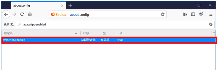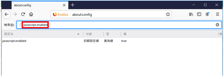 4.検索欄に「javascript.enabled」と入力します。設定項目[javascript.enabled]欄が表示されます。
