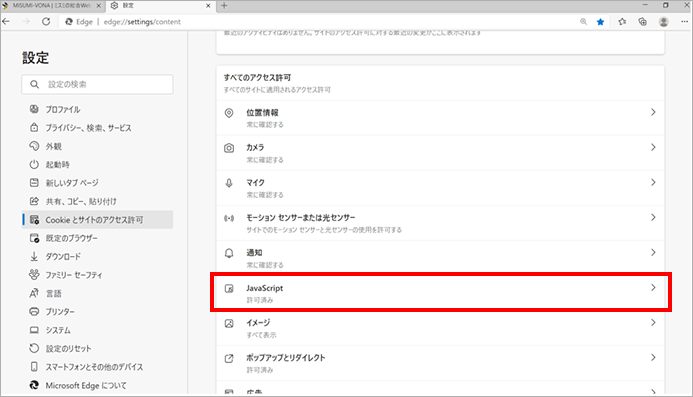 3.[すべてのアクセス許可]のセクションまでスクロールし、[JavaScript]をクリックします。