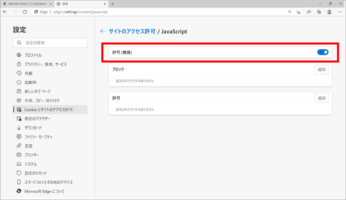4.[許可(推奨)]のトグルをクリックしオン(右側の状態)にします。