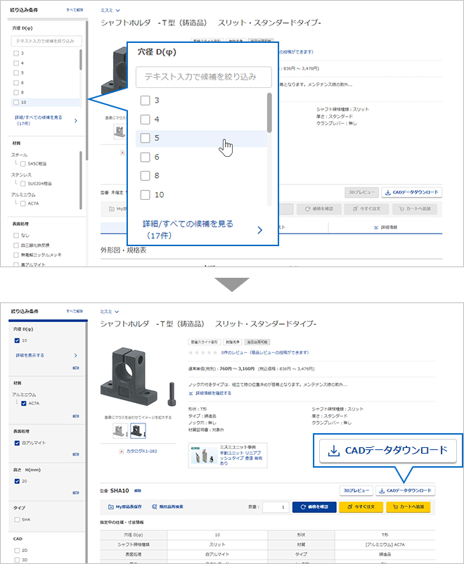 仕様・寸法が確定すると該当の型番が表示され、「CADデータダウンロード」ボタンからCADデータをダウンロードできます。