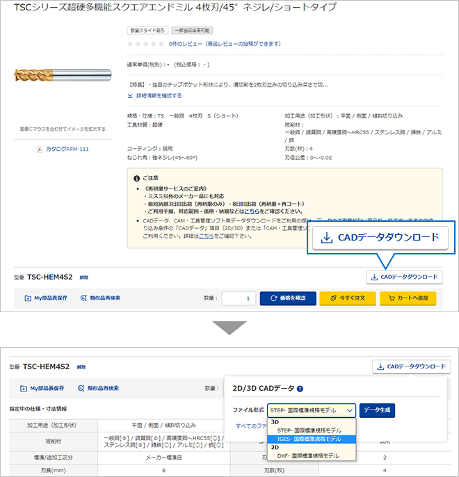 「CADデータダウンロード」ボタンをクリックするとファイルフォーマットの選択が可能になります。