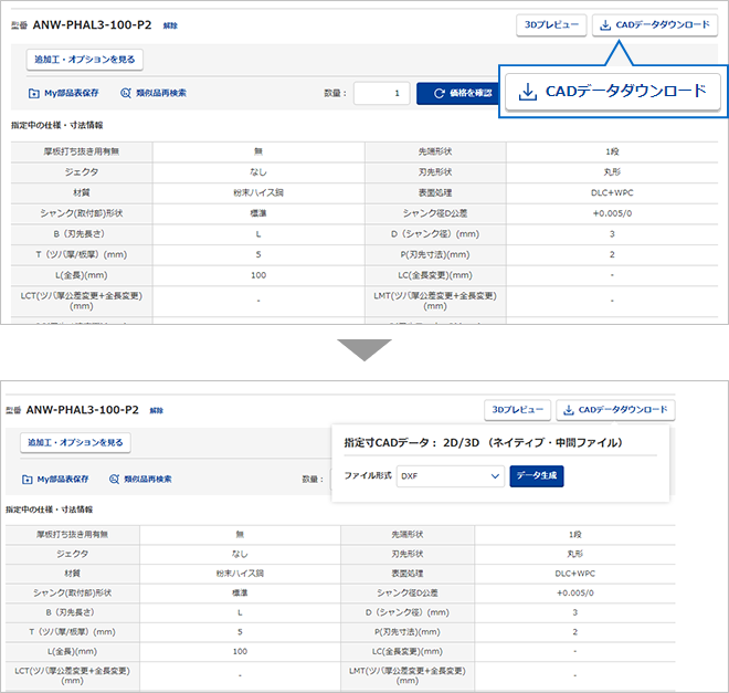 「CADデータダウンロードボタン」をクリックし、ご希望のファイル形式でCADデータがダウンロードできます。
