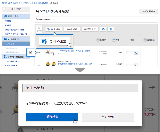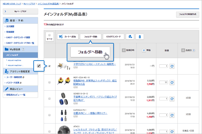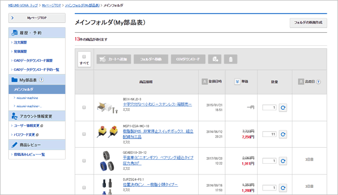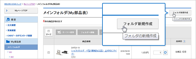 My部品表では、型番等の商品情報を保存し、フォルダで管理をすることができます。