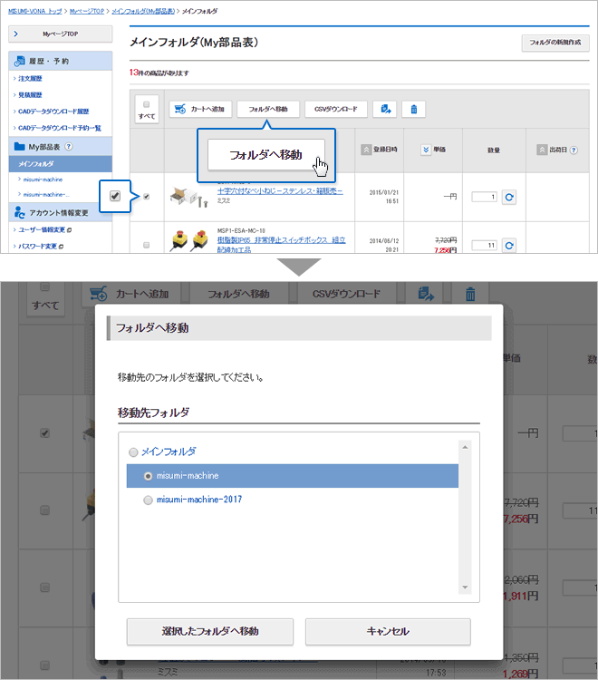 My部品表の中から、移動したいフォルダを選択し、「フォルダへ移動」をクリックします。
