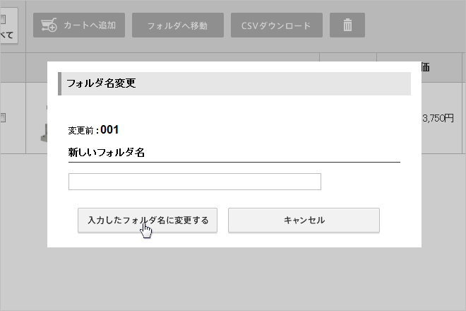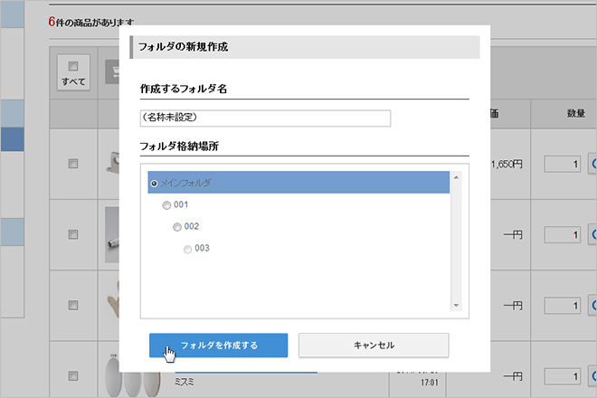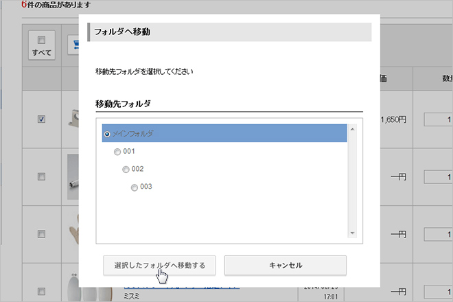 移動先のフォルダを選択し、「選択したフォルダに移動」ボタンをクリックすると、選択したフォルダへ商品が移動します。