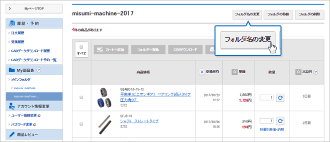 My部品表の中から、名前を変更したいフォルダを選択し「フォルダ名を変更」をクリックします。