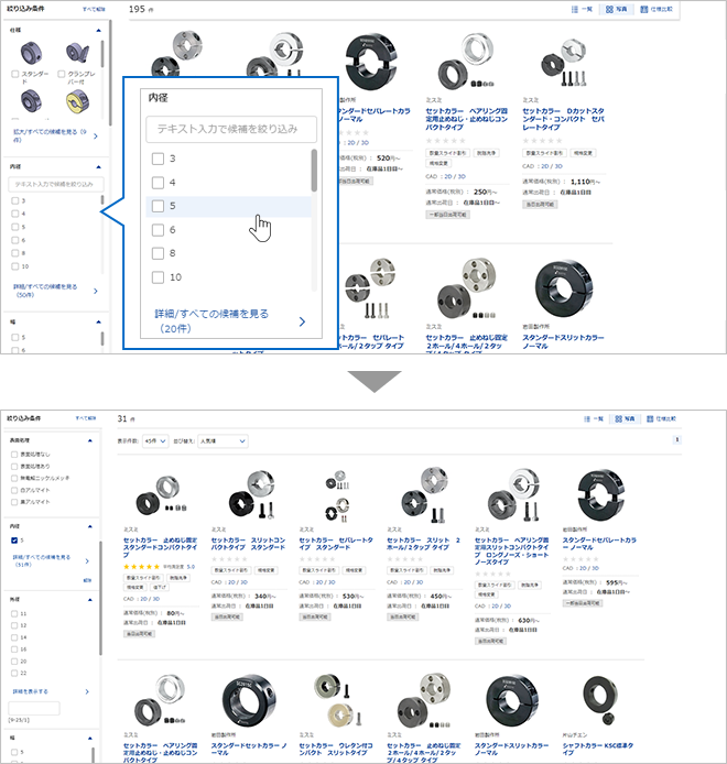 絞り込み条件を選択すると、商品リストから対象件数が絞り込まれます。