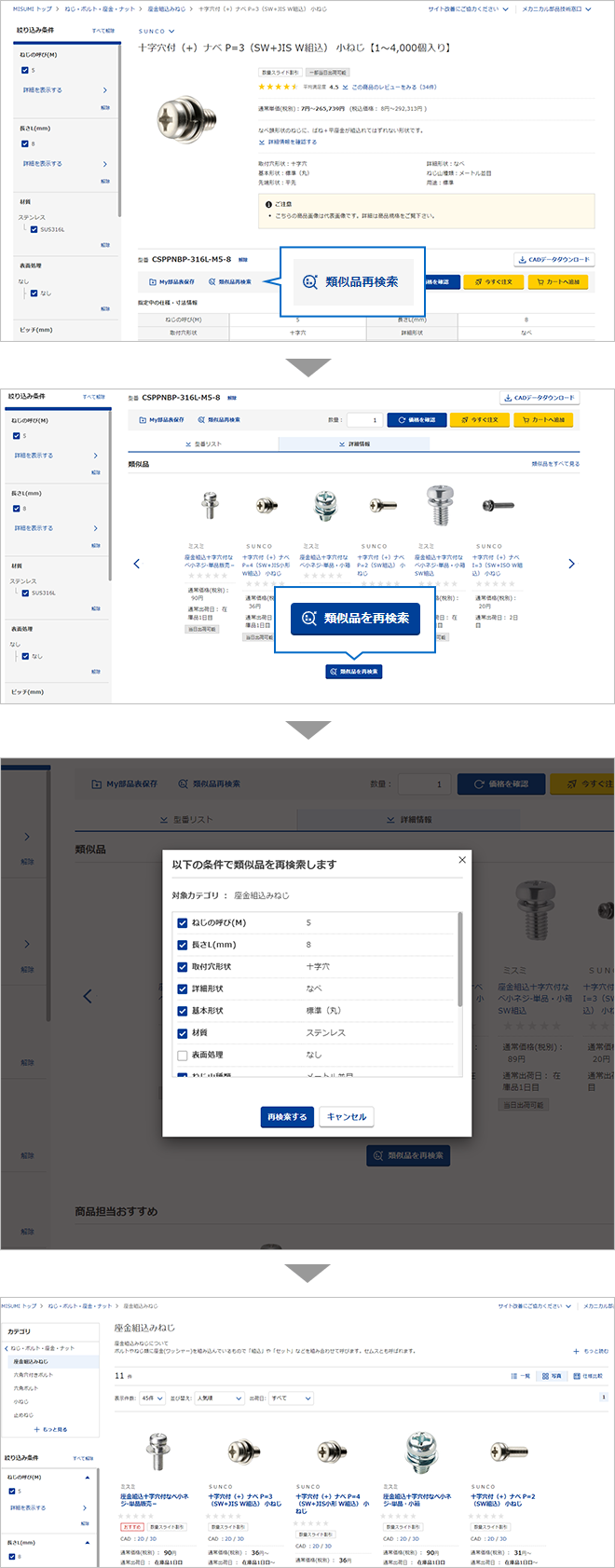 商品ページでは、ご指定いただいた仕様・寸法や、商品個別の仕様に基づいて、類似した商品をリストアップすることができます。