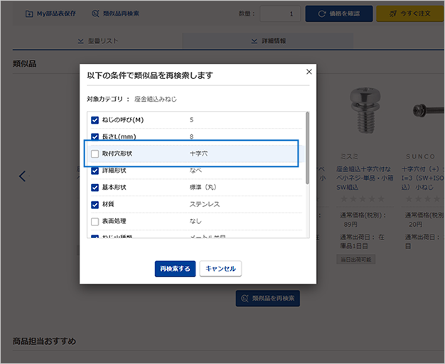 「類似品再検索」ボタンをクリック後に表示される画面の該当箇所にチェックを入れ「OK」ボタンをクリックすると、類似した仕様の商品のリストが表示されます。