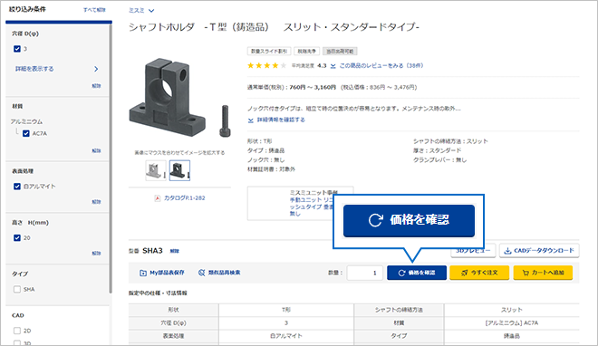 商品ページでは、「価格を確認」ボタンをクリックすれば、その場でお見積が可能です。
