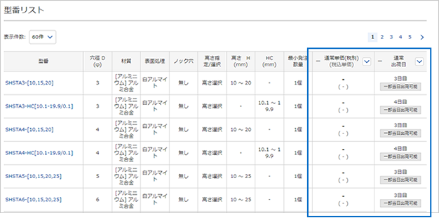 商品ページや絞り込み検索ページでは、通常単価や通常出荷日を確認できます。