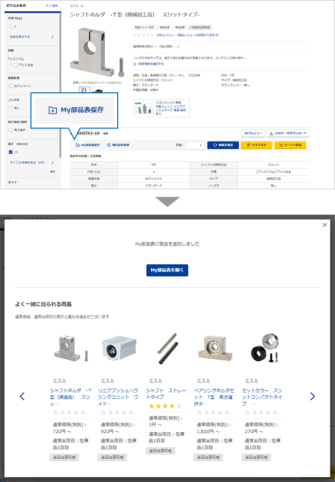 商品ページでは、型番などの商品情報をMy部品表に保存することができます。