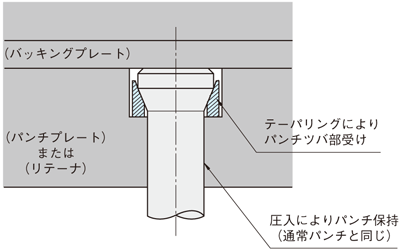 ● テーパヘッドパンチはパンチとテーパリングの現物合わせ加工により、ツバ厚公差8 +0.03/+0.01を出しています。パンチとテーパリングは同じ識別マークのものを組み合わせて使用してください。