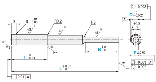 | 型式 | 指定0.1mm単位 min. L max. | 指定0.001mm単位 min. P max. | T | 指定1mm単位 B | V | ||