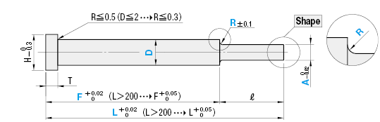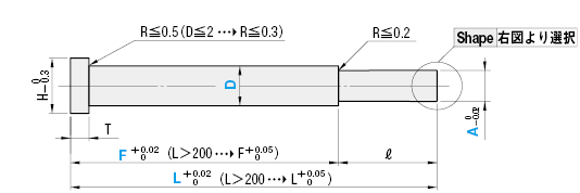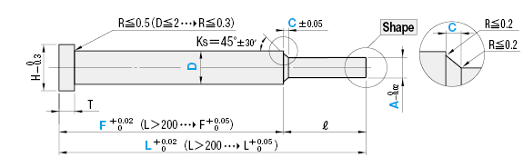 | 3 | 4 | - | - | CPNS-5 | - | B C D E | 先端加工ナシ の場合は 指定不要 C G T R B | 1.5 | 70.00 ~ 200.00 | F≧50.00 | D-0.02> A≧Amin. | 0.50 | Step Dのみ 0.1≦C≦1.5 and C< D-A2 Step Eのみ R≧0.3 and R≦ D-A2 | ℓ≦12×A and ℓ≦35 |