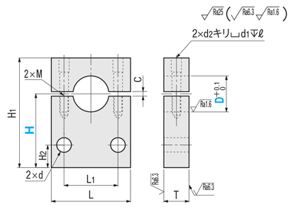 | 型式 | H 選択 | L | H1 | H2 | T | L1 | d | 締付ボルト M | d2 | d1 | ℓ | C | ¥基準単価 | ||||||||