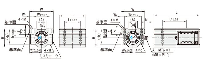| 型式 | L | L1 | h | H | (H1) | (H2) | W | W1 | W2 | M | d | ℓ | (A) | (B) | N | 基本定格荷重 | 静的許容 モーメント (N・m) | 質量(g) | ¥基準単価 | |||||||||||