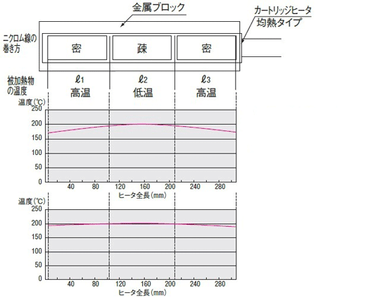 [ ! ]本製品は、従来のカートリッジヒータと比較して、均熱効果が向上しますが、被加熱物の完全な均