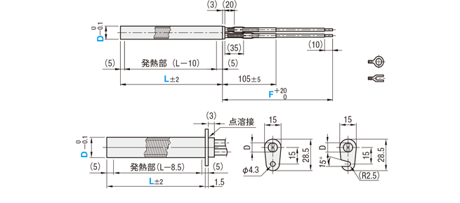 ・ヒータシース部内で発熱線とニッケル撚り線を接続し、シース外部でニッケル撚り線とリード線を結線しております。