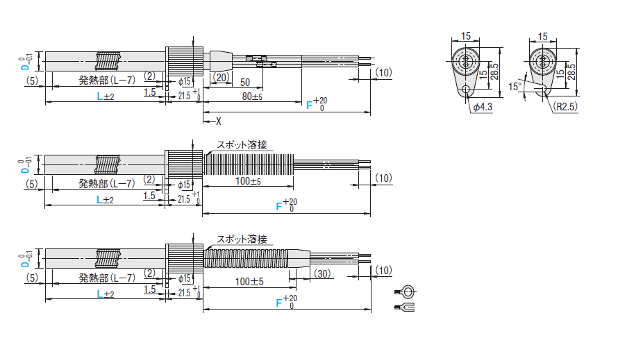 | MCHXAC MCHXBC | A (1.1:1:1.1) B (1.3:1:1.3) | 6 | 150〜250 | 100 | 70〜500 | B G T M | 100〜1000 (指定10mm単位) 2000 3000 4000 5000 (固定寸) ※公差0~+50 | N S C | N M Y | 2≦W/cm2≦15 [ ! ]W/cm2=W/{D x π x (L-7)/100} (全長ではなく、発熱部(L-7)の電力密度で計算してください) |