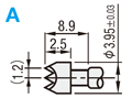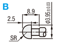[ ! ]B:ハンダ・カシメタイプとは、リード線素線をB形状のΦ2.01穴に入れてハンダを流し入れて固定するか、