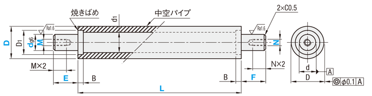 | 型式 | dg6 選択 | L 指定10mm単位 | E・F 指定1mm単位 | M(並目)・N(並目) 選択 | P・S 指定1mm単位 | d1 | D1 | B | t許容差 | d2許容差 | 適用止め輪 | |||||||||||