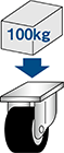 | キャスタが1個だと 100kgの荷重がかかります。 | 台車の重量が12kgとすれば総重量は112kgになります。 総重量(112kg)に対するキャスタ1個あたりの荷重は 28kgになります。 | ||