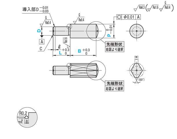 | (丸) m6 LPEJ LPEG LPE LPEB LPER LPES LPED LPEC | (丸) p6 LPPEJ LPPEG LPPE LPPEB LPPER LPPES LPPED LPPEC | (ダイヤ) m6 LPDEJ LPDEG LPDE LPDEB LPDER LPDES LPDED LPDEC | A B C | 2 | +0.008 +0.002 | +0.012 +0.006 | 2.50〜6.00(4.00) | 2.0〜25.0(10.0) | A形状 R≧P/2 C形状 R≦P/2 | B形状 G≦P | 2〜6 | 0.5 | 0 | 1.2 |