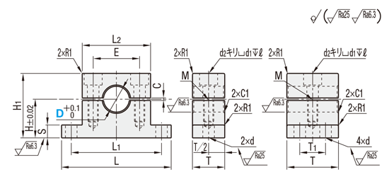 | 型式 | H | L | H1 | T | T1 | L1 | d | L2 | S | E | C | 締付ボルト M | d1 | d2 | ℓ | 質量 g | ¥基準単価 | ||