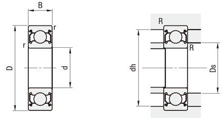 | 型番 | d | D | B | r (min) | 基本定格荷重 | 許容回転数 rpm (参考) | 取付寸法 | 質量 (g) (参考) | ¥基準単価 | ||||