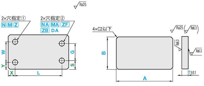 | 型式 | 指定0.1mm単位 | X | Y | W | 穴指定① | L | S | G | 穴指定② | |||||||