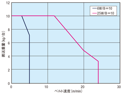 速度の低下に伴い、搬送可能重量が低下します。