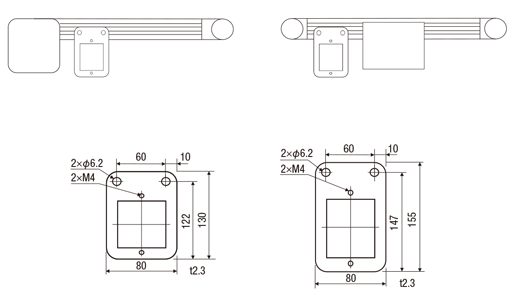| スピードコントローラ用ブラケット付属(ブラシレスモータのコントローラにも適用可) 指定方法 SCB ![]() <スピードコントローラブラケット規格図> ①スピードコントローラブラケット ②高出力コンベヤ/ | SCB | スピードコントローラ用の取付ブラケットを付属します。 指定方法 SCB パナソニック・オリエンタル・台湾製モータのコントローラに対応します。 [ ! ]ブラケット取付用ねじ2個付属 [ ! ]コントローラ取付用ねじ(M4×8)2本付属 [ ! ]コンベヤ機長によっては、スペース上取り付かない場合があります。 [ ! ]コンベヤ型式やモータ仕様によりブラケットの形状が異なります。 [ ! ]対応型式はこちらの適用表をご参考ください。 [ NG ]海外電圧TA100、TA110、TA115、TA200、TA220、TA230におけるパナソニック製スピードコントローラに適用不可。 | 800 |